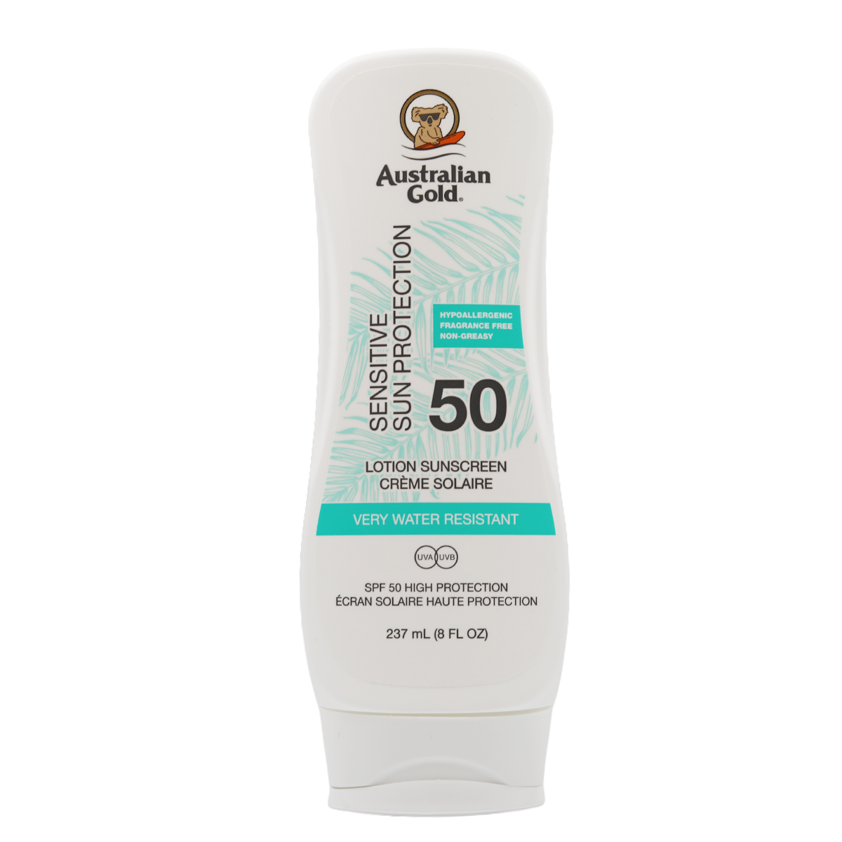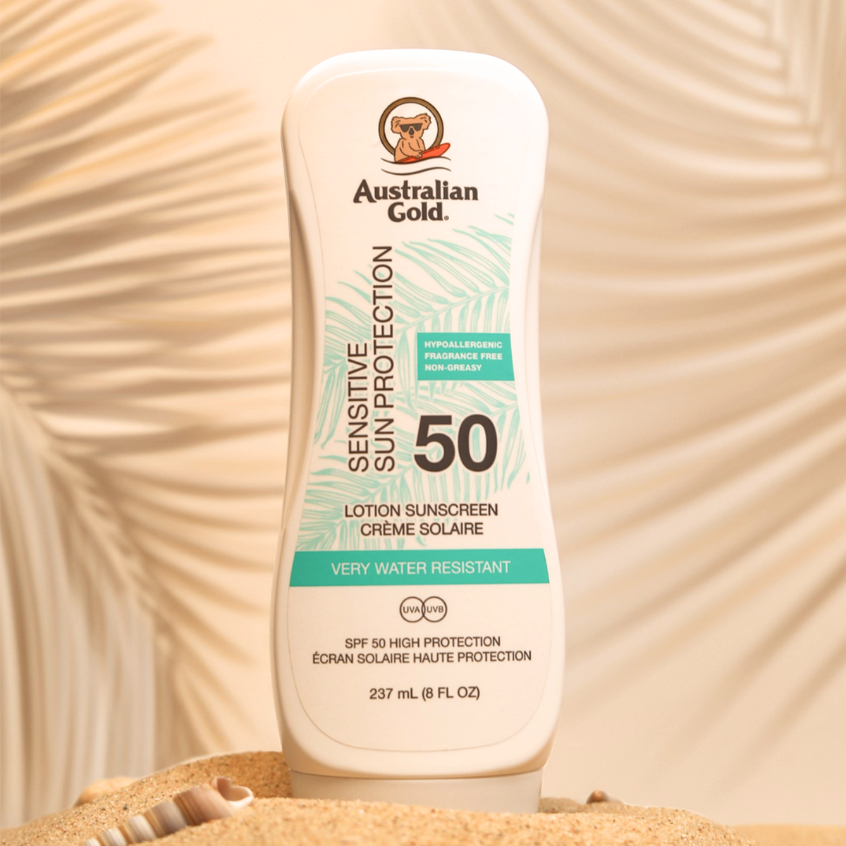 Australian Gold SPF 50 Sensitive Skin Lotion, een zachte maar krachtige zonbescherming speciaal ontwikkeld voor iedereen die extra huidcomfort nodig heeft. Deze hypoallergene formule biedt